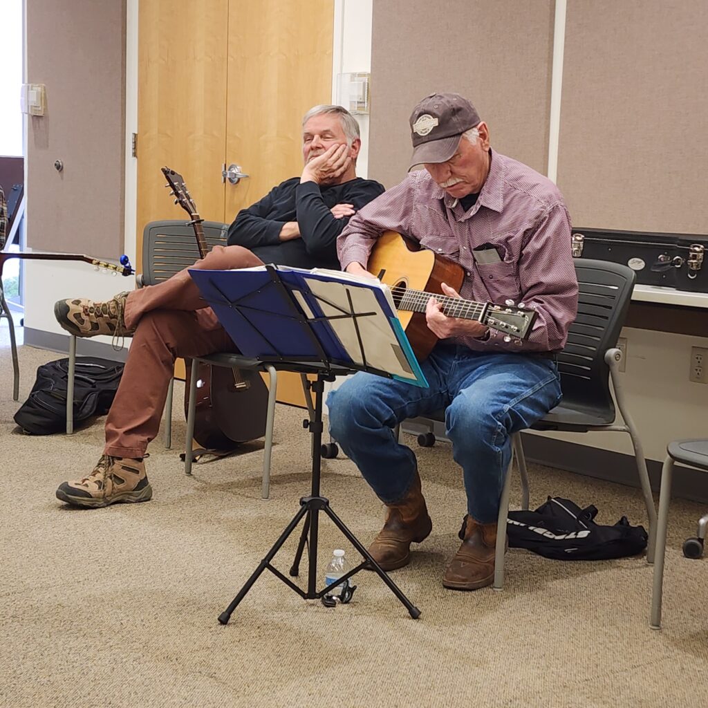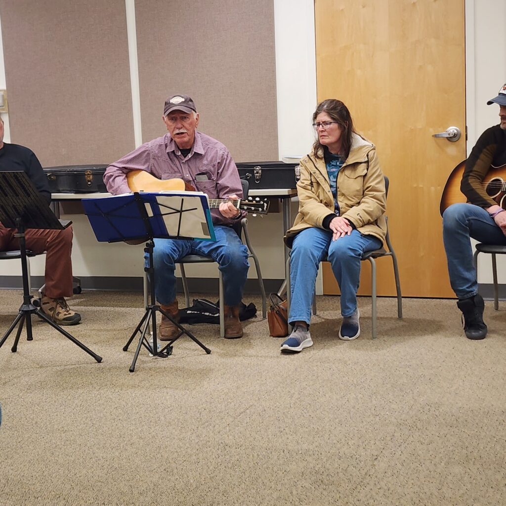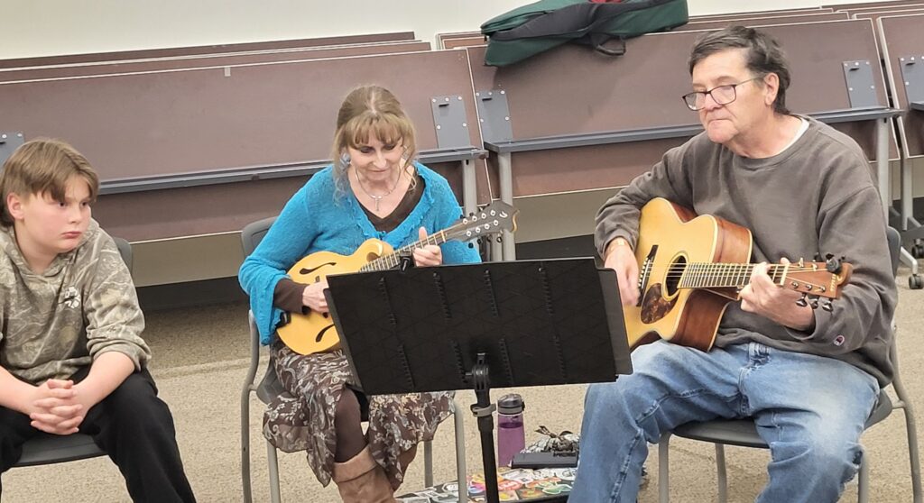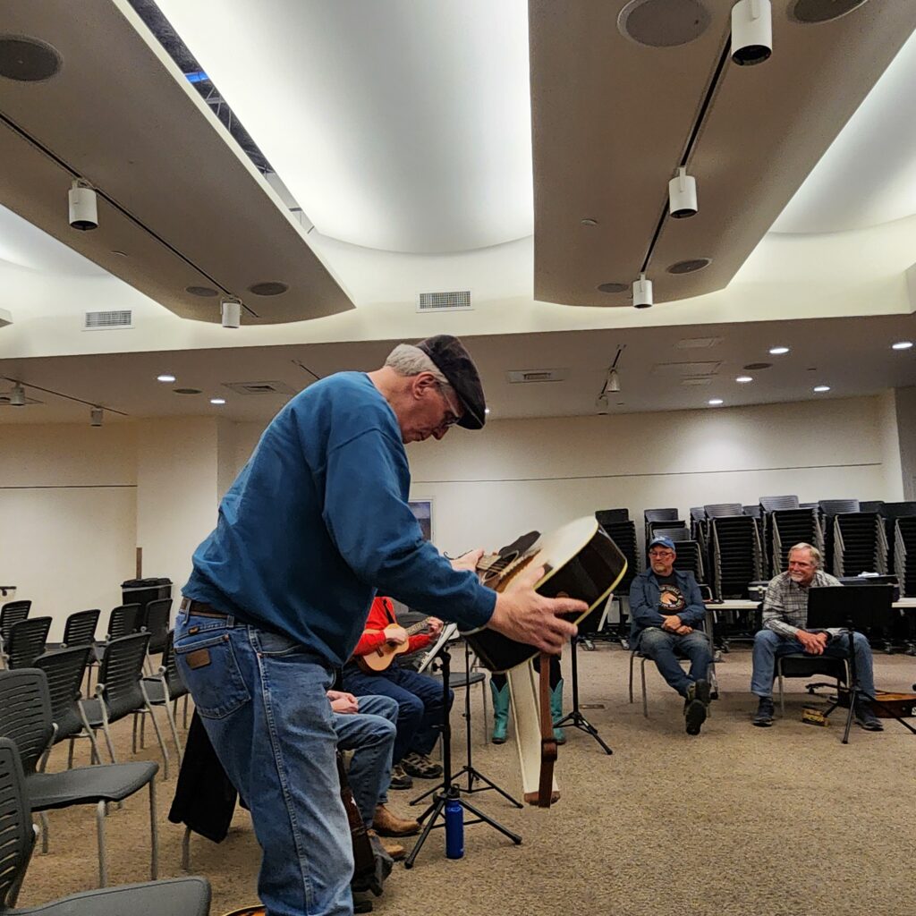 Back in the library’s Cottonwood Room, a baker’s dozen fools rushed in to share some tunes. A warm welcome to Colton and his designated driver/mom, Sarah. Colton is just learning to play the guitar and came to check us out. Nancy also invited them to the bluegrass jam that upcoming Saturday, where everybody plays on every tune. Let’s hope that works for Colton and gets him motivated to learn that six stringed orchestra.