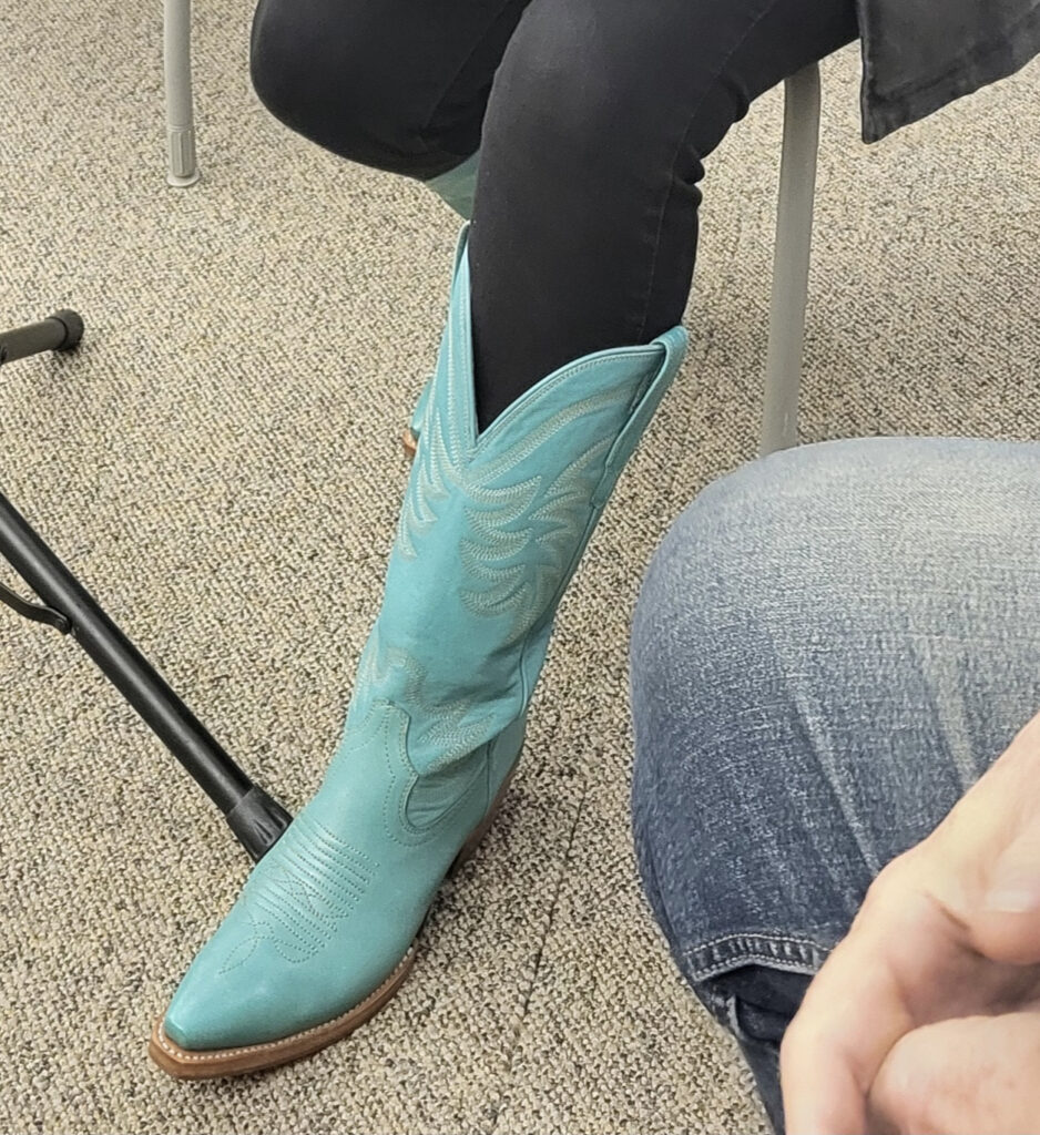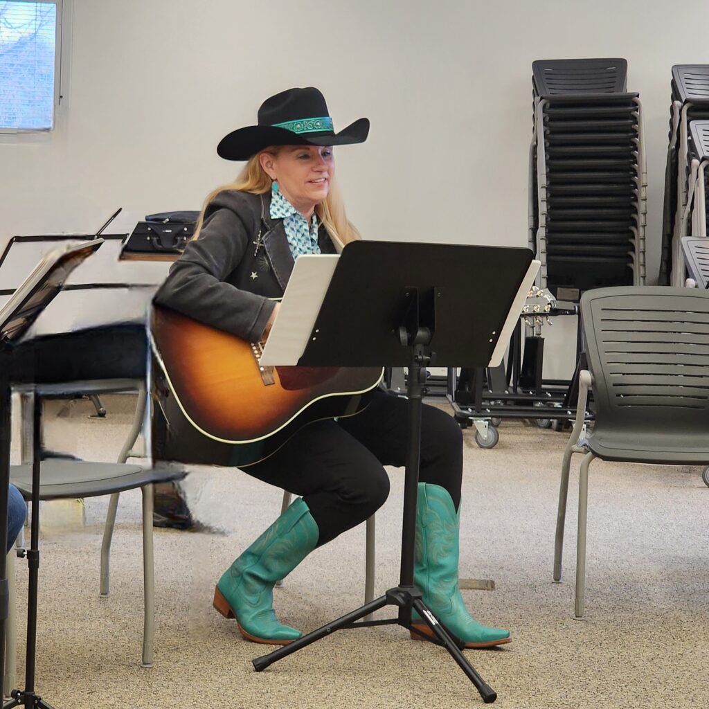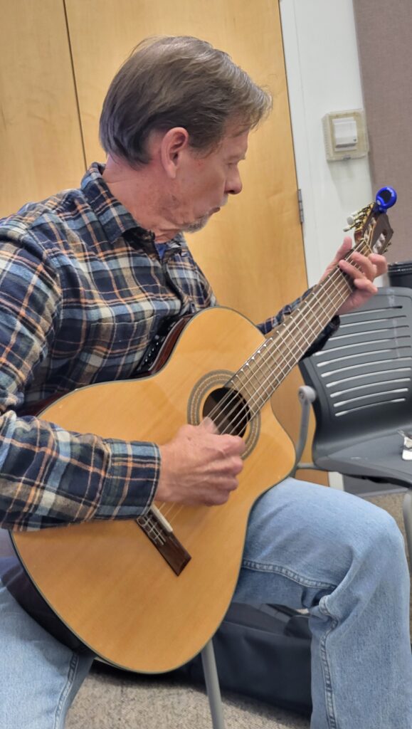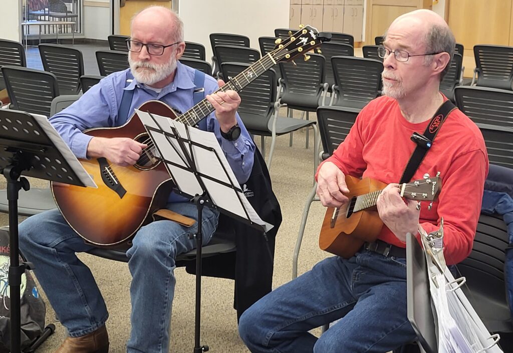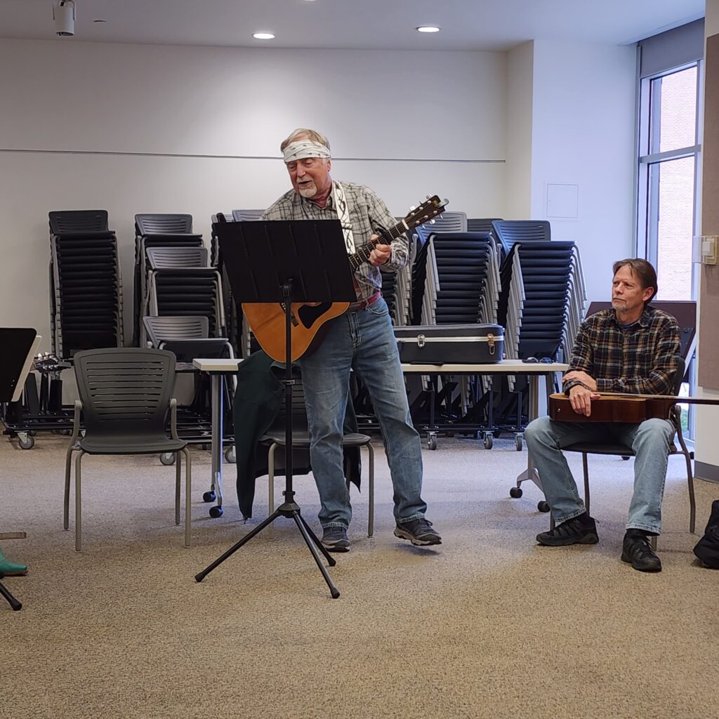 Back in the library’s Cottonwood Room, a baker’s dozen fools rushed in to share some tunes. A warm welcome to Colton and his designated driver/mom, Sarah. Colton is just learning to play the guitar and came to check us out. Nancy also invited them to the bluegrass jam that upcoming Saturday, where everybody plays on every tune. Let’s hope that works for Colton and gets him motivated to learn that six stringed orchestra.
